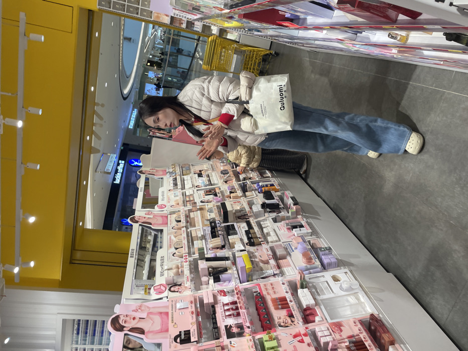 A woman in a puffy jacket and jeans stands at a makeup display in a store. The display features a wide array of cosmetics, neatly arranged. She has a white tote bag slung over her shoulder. Behind the woman, other shoppers and storefronts can be seen, suggesting a busy mall environment. Bright yellow fixtures illuminate the space.