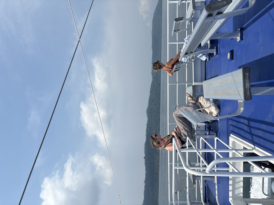 Two people recline on seats on the deck of a boat or ferry. One wears pants and a tank top and reclines fully. Another, wearing a swimsuit, sits in a chair facing away from the first person. The deck is blue and white and the background consists of the sea, land, and sky. A long cable stretches diagonally across the sky.