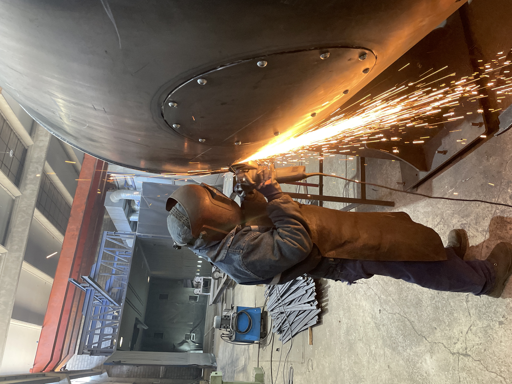 An industrial workshop in Tomba, Montenegro, shows a single individual engaged in metal grinding. The person, positioned facing right, is wearing a welding helmet with the visor down, a blue denim jacket, dark blue trousers, a brown leather apron, and dark work boots, indicating protective attire. They are operating an electric angle grinder with both hands, directing it towards a large, dark grey cylindrical metal object, possibly a tank or vessel, which rests on a dark metal stand. A bright cascade of orange sparks emanates downwards and leftward from the point of contact. The cylindrical object features a circular plate secured by multiple bolts on its surface, and faint white markings are visible. To the left, a pile of dark, rectangular metal bars lies on the concrete floor, behind which a blue industrial machine with hoses is visible. The background reveals light-colored block walls, a red overhead crane beam, a blue metal gantry or walkway, and industrial lighting fixtures, indicating a heavy manufacturing environment. The concrete floor shows signs of wear.