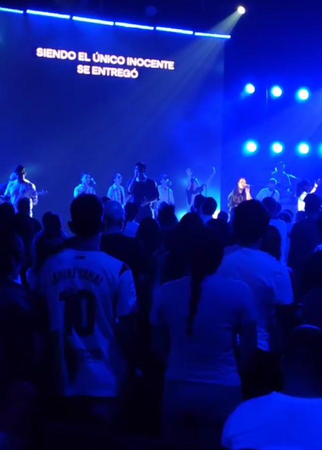 large crowd of people silhouetted against a stage. On the stage, a band is performing with guitars and singers. Lyrics are displayed on a large screen behind the band. The stage is lit with blue spotlights and stage lights. A single beam of light shines down onto the screen from above. The crowd appears to be watching the performance and some are holding their hands up.