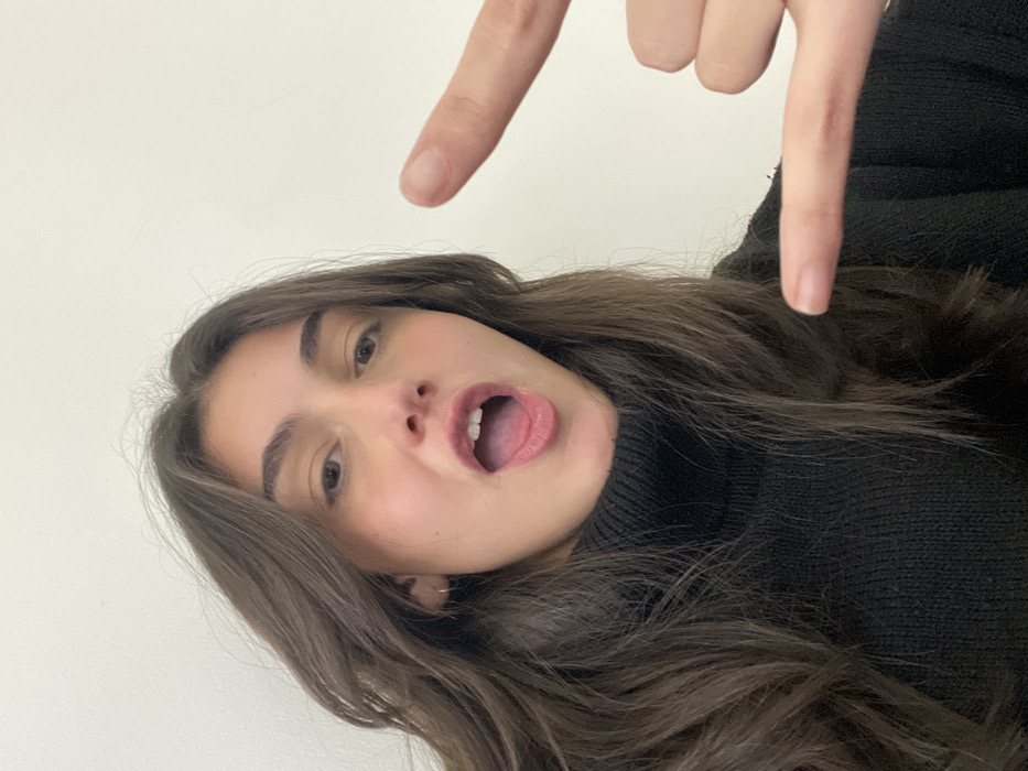 A young adult female is depicted in a close-up, front-facing indoor portrait. She has long, dark brown hair that falls over her shoulders and chest. She is wearing a black, ribbed turtleneck sweater. Her mouth is open wide, revealing her tongue and the inside of her mouth. Her right hand is raised into the lower right portion of the frame, forming a "rock and roll" gesture with the index finger and pinky finger extended, and the middle, ring, and thumb fingers curled. The background is a plain, unadorned white wall, providing no specific environmental details to determine a location within Montpellier, France.