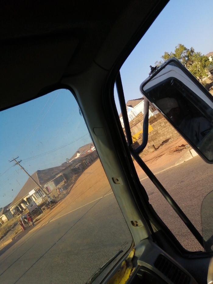 view from inside a vehicle, likely a truck, looking out the windshield and side mirror. A road stretches into the distance with buildings lining the side, including some with reddish-brown roofs. The side mirror reflects the driver. The sky is clear and blue. Power lines run alongside the road, and some pedestrians are visible near the buildings.