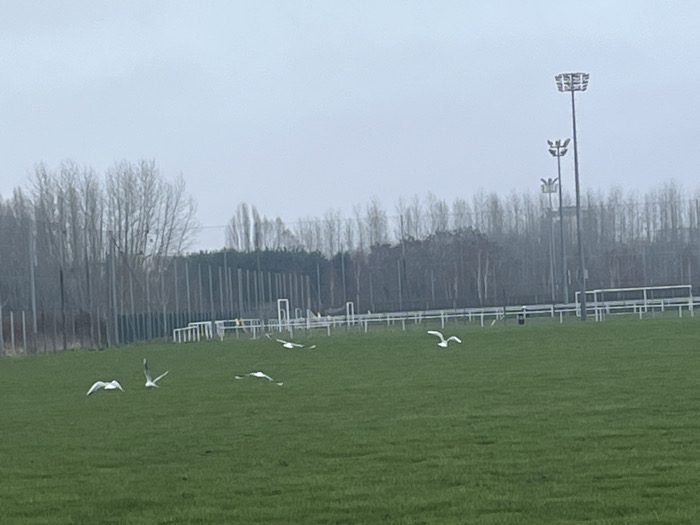 A grassy field under an overcast sky features a flock of six white birds in flight. In the background, tall trees and a fence line are visible. Three tall light poles stand to the right, adding to the sparse landscape. The scene is muted in color, reflecting the dreary weather. The field's purpose is unclear, though its proximity to fences and poles suggests a sporting area.