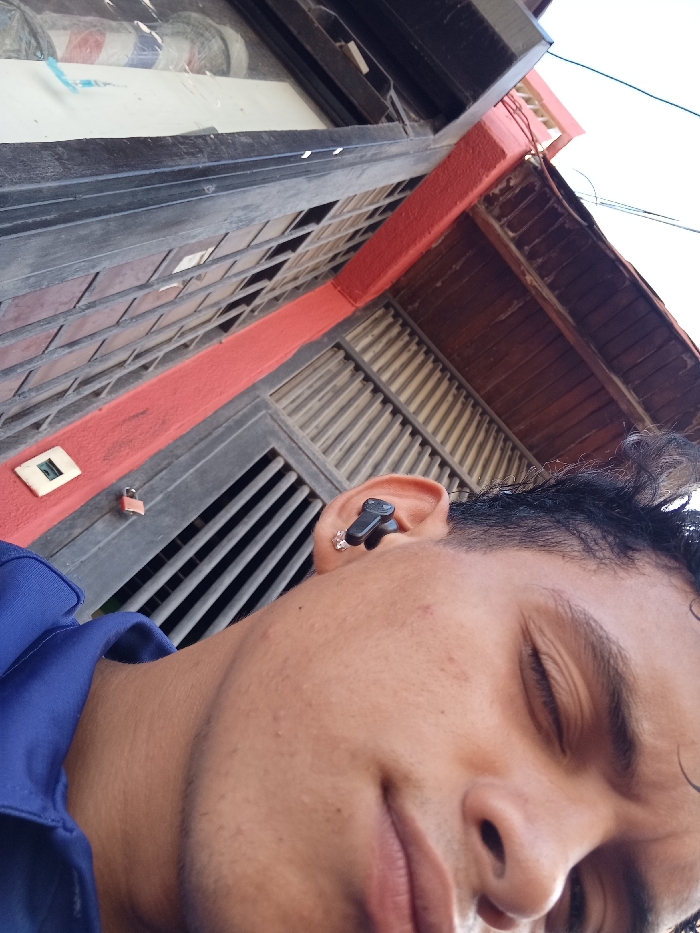 A man's face is visible from the nose up. He is wearing a wireless earbud in his left ear, and an earring can be seen in the same ear. His eyes are closed. The background shows a building's exterior, featuring a red-painted wall, a window with metal bars, and a wooden roof overhang. A small, unidentifiable object is mounted on the red wall, and a lock is hanging. The perspective is angled, looking upwards towards the building.