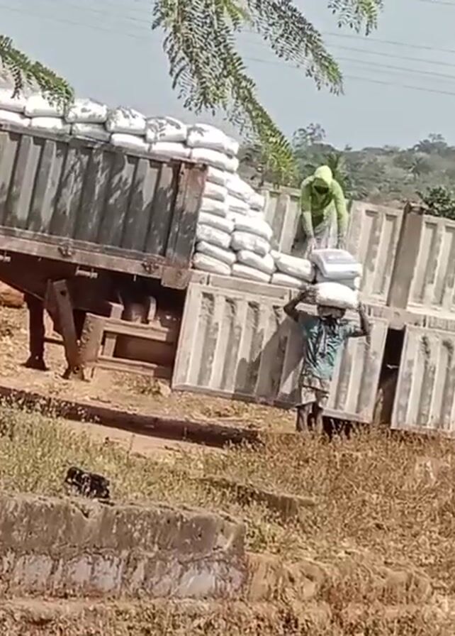 Two men are unloading bags from a truck. The truck bed is filled with stacked bags. One man is standing on top of the truck, handing bags to the other man standing on the ground. The man on the ground is carrying bags on his head. The surrounding area is a dry, grassy field. The scene appears to be taking place outdoors on a sunny day.