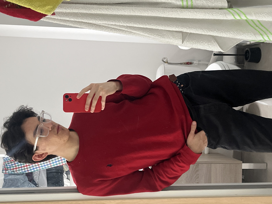 The image depicts a single individual, appearing young, reflected in a mirror within an indoor setting, identified as a location in Villeneuve-d'Ascq, France. The individual has dark, wavy hair and wears clear-framed rectangular glasses. They are dressed in a solid red long-sleeved crew-neck sweater, displaying a small dark embroidered logo on the left chest, and black trousers. A dark brown belt with a silver-colored buckle is visible around the waist, with a segment of a white-dotted dark fabric showing above the trousers. The subject holds a red-cased smartphone in their right hand, directing it towards the mirror to capture a self-portrait. Their left hand is placed inside their left trouser pocket. The background, also reflected in the mirror, includes a white ceramic toilet, a black toilet brush with its holder on the floor, and several towels (predominantly white, one with green stripes, and one yellow) hanging from a fixture to the right. A light-colored wooden or laminate vanity unit is partially visible on the far left. In the upper left, beyond the individual's head, an array of folded garments is visible. The walls are light-colored.