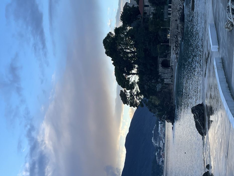 The image displays a coastal scene in Herceg Novi, Montenegro, during twilight hours. The sky occupies the upper frame, transitioning from light blue at the top right to shades of grey and faint pink-orange near the horizon, marked by stratified cloud formations. The lower half features a calm body of water, a bay, exhibiting subtle ripples and reflecting the overcast sky. In the foreground, a smooth, light-colored concrete platform or promenade runs along the water's edge. A white, curved concrete barrier or bench is present on the platform's right side. A metal ladder for water access descends from the concrete into the bay. A large, dark, irregularly shaped rock formation is partially submerged in the shallow water in the mid-foreground. To the right, a rocky promontory, densely covered with dark green trees, primarily pines, and agave-like plants, extends into the bay. At the base of this promontory, a stone archway or tunnel entrance is visible, built into the rock face. A paved walkway or path, lined with visible streetlights, follows the promontory's base past the archway. A building with a reddish-brown tiled roof is partially observable above the tree line on the far right of the promontory. In the distant left, dark, undulating mountains rise, their silhouettes prominent against the sky. Along the distant shoreline at the base of these mountains, a cluster of light-colored urban buildings is discernible, some featuring modern terraced architecture. A large, white, multi-deck vessel, consistent with a cruise ship, is present in the distant bay near the urban area. A small, dark, indistinct object or possible human figure is located in the water, to the left of the prominent foreground rock.