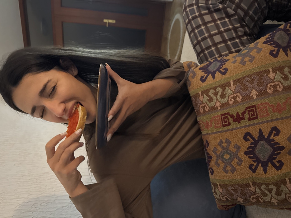 - "A woman with dark hair eats a sandwich with red topping, likely caviar" by FM-fSbZr2, licensed under CC BY 4.0