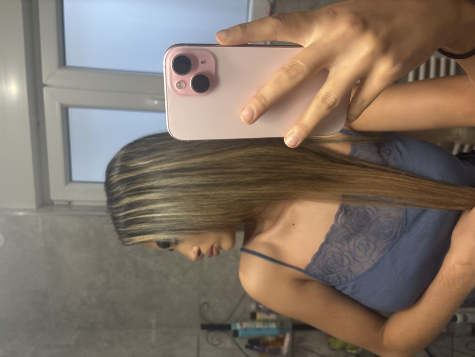 A female subject is depicted in a mirror selfie, seen primarily from the chest up, within what appears to be a residential bathroom. The subject, possessing long, straight hair with prominent blonde highlights and darker underlayers, is shown in profile, facing left, with a small stud piercing on her left nostril. She wears a light blue camisole featuring a lace overlay with a floral pattern across the upper chest. Her right hand, prominent in the foreground, holds a pink smartphone with a dual-camera system, positioned to capture the mirror reflection. The background, also reflected in the mirror, displays a wall clad with light grey rectangular tiles. In the upper right, a white-framed, double-paned window is visible, with the view beyond obscured or uniformly light. To the left, a shelf or counter holds an assortment of toiletries, including bottles of blue, red, and white colors. A dark, curved fixture is partially visible on the left wall, above the toiletries. In the lower right, a horizontal ribbed object, consistent with a radiator, is partially discernible. This image contains no visual information to ascertain its specific location within the city of Erstein, France.