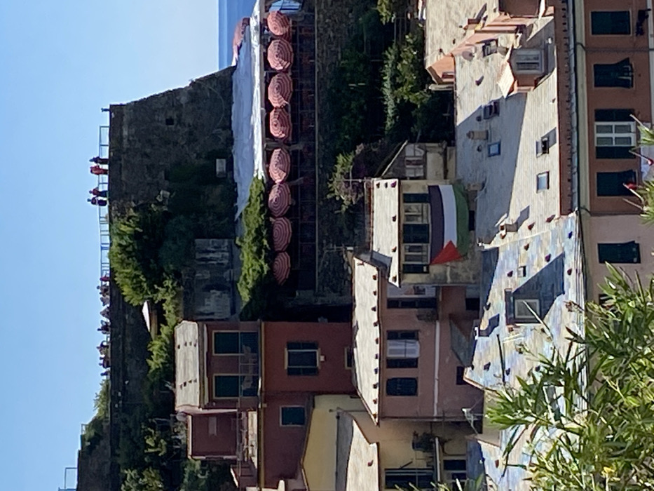 This image captures a multi-tiered view of Vernazza, Italy, under a clear blue sky. In the upper section, a group of approximately 15-20 indistinct human figures is visible on a flat, open area atop a stone fortification or cliff edge. They appear to be standing and observing, positioned behind a light blue railing. To the right, the deep blue Tyrrhenian Sea is visible. Below this fortification, and integrated into the hillside, is a restaurant terrace. This terrace features a row of eight circular patio umbrellas, all fully open and displaying a distinct red and white striped pattern. Below the umbrellas, dark tables and chairs are discernible, suggesting an outdoor dining area. Further down the hillside, a cluster of traditional multi-story Italian buildings dominates the mid-ground. One prominent red-painted building features multiple windows with dark green shutters; its upper level includes two small balconies, one of which holds what appears to be a small table and two chairs. Adjacent and below are other residential structures in various hues, including pale pinks and yellows, with flat or gently sloping roofs of varied colors. In the lower-mid ground, on the facade of a light beige two-story building, a flag is prominently displayed. The flag is rectangular, composed of three horizontal stripes—black (top), white (middle), and green (bottom)—with a red triangle on the hoist side that overlaps the black and white stripes. This flag is draped over a balcony or window railing. The foreground contains sparse green foliage, partially obscuring the lowest visible buildings. Sunlight illuminates the scene, creating distinct shadows on the roofs and buildings.
