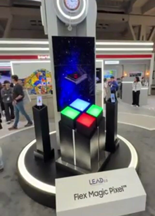 display at a trade show featuring "LEAD 2.0 Flex Magic Pixel" technology. The display consists of a central, tower-like structure. At the top of the tower is an analog clock. Beneath the clock is a vertical screen displaying various changing patterns of color and light. At the base of the screen are nine cubes arranged in a square, each lit with a different color: blue, red, and green. The tower is mounted on a circular platform with a white light ring around the edge. Two smaller black pedestals stand on either side of the central display, each holding a smartphone-sized device displaying an image. A sign in front of the display reads "LEAD 2.0 Flex Magic Pixel." Several people are walking around in the background, looking at other displays. The environment appears to be a large, open convention hall with various booths and displays.