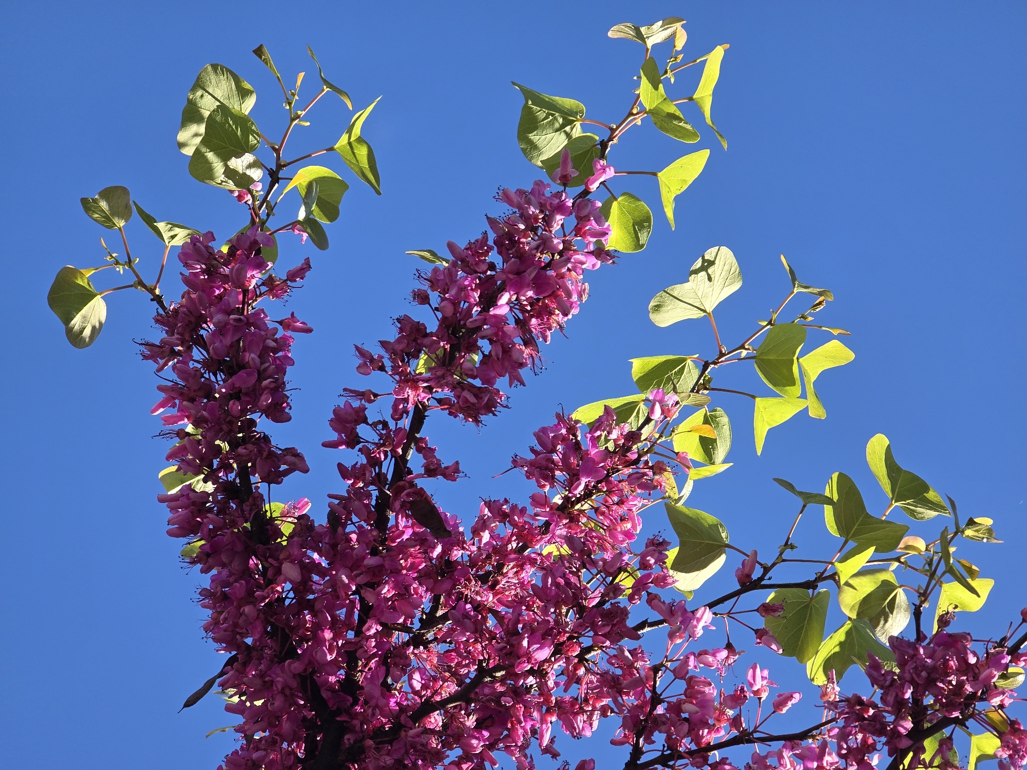 flowering tree against a clear blue sky. The tree has branches with bright pink blossoms and light green leaves. The location and city are unknown.