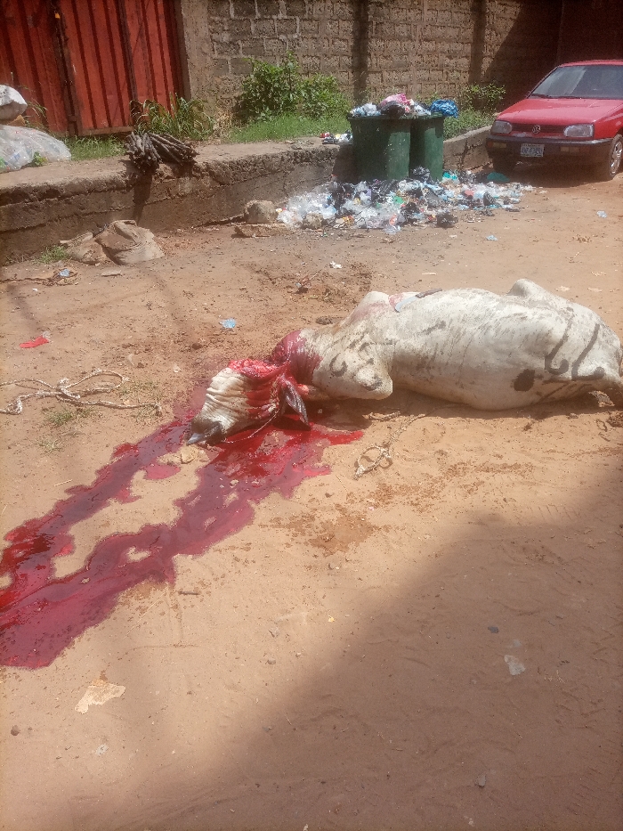 A gruesome scene depicts a dead cow lying on a dirt road, its head nearly severed. A large pool of blood surrounds the head. Behind the cow are overflowing trash cans with scattered waste and a red car. The setting appears to be a street with buildings and greenery visible in the background. The image conveys a sense of violence and disregard for animal welfare.