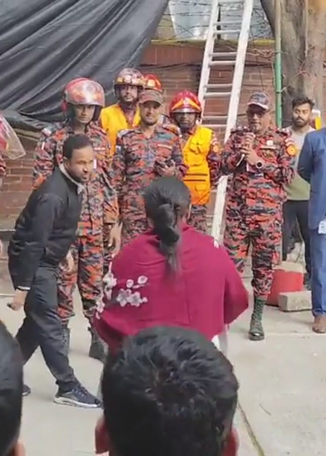 A group of people is gathered in an outdoor area, likely a training or demonstration space, possibly near a building. A fire burns inside a small container in front of the group. Many of the people in the group are uniformed firefighters wearing helmets. One firefighter holds a handheld device. A man in a blue suit stands near the fire and watches. A woman in a maroon wrap stands near the fire. Other individuals, dressed in casual clothing, are also present, some taking pictures with their phones. A ladder leans against a tree in the background.