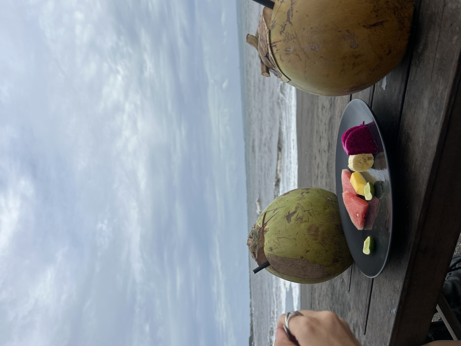 The image depicts a dark wooden table positioned on a black sand beach, overlooking a grey, wavy ocean under a heavily overcast sky. On the table, two whole coconuts with black drinking straws are present: a green coconut with a brown stripe on the left, and a yellowish-brown coconut partially cropped on the right. Between them, a black oval plate contains a selection of cut fruits: two red watermelon slices, one yellow mango slice, one light yellow banana slice, one magenta dragon fruit slice, and two green lime wedges. A partial human left hand, featuring a silver-colored ring on the ring finger, rests on the table to the left of the green coconut. Faint landmasses are visible on the distant horizon to the left. This scene is located in the city of Unknown, Unknown.