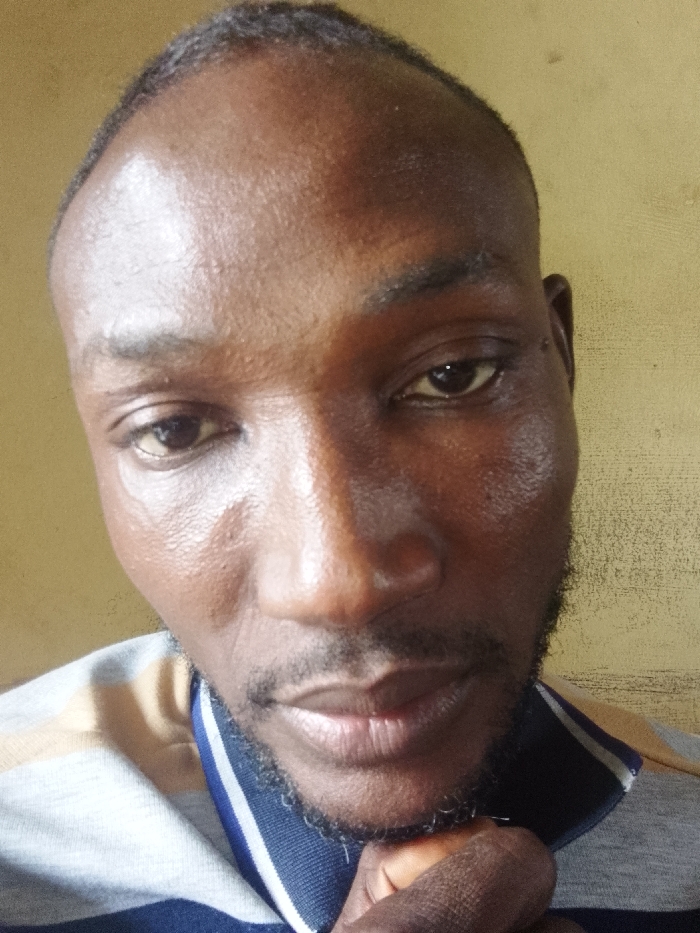 A close-up image depicts an adult male individual, facing slightly left of center, against a light brown or tan wall with visible texture, located in Sabon Tasha, Nigeria