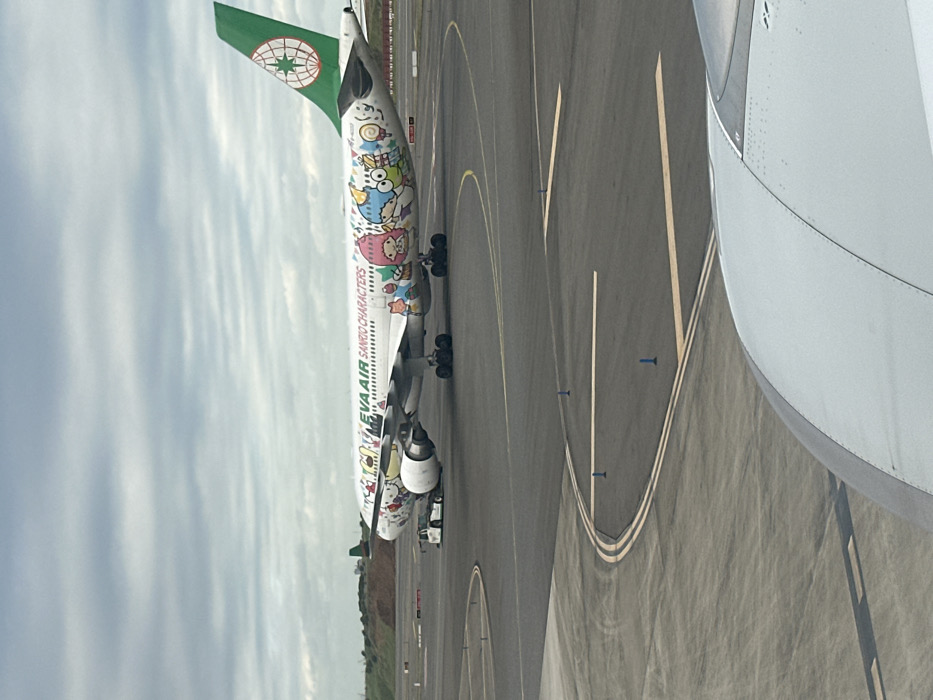 An EVA Air plane with Sanrio characters livery sits on the tarmac