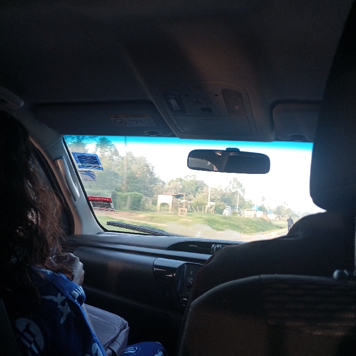 The image captures a view from within a vehicle, looking forward through the windshield onto an unpaved road in Butsotso central ward, Kenya, during daytime. **People:** - A person with long, dark, wavy hair occupies the front passenger seat, facing forward. They are dressed in a blue garment with a white circular pattern and hold a light-colored handbag. - The rear of a second person's head and right shoulder, wearing dark attire, is visible in the driver's seat on the right. - A lone individual in dark clothing is walking on the distant right side of the unpaved road. **Vehicle Interior:** - The vehicle's dashboard and interior trim are dark-colored. - The windshield displays two blue-and-white stickers and one red-and-white sticker affixed to its upper-left section. - A rearview mirror is centrally mounted above the dashboard. - An overhead console with various buttons is visible on the ceiling. - A single windshield wiper blade rests horizontally on the lower portion of the windshield. **Exterior Environment:** - The vehicle is situated on a light-colored, unpaved road. - The surrounding landscape is characterized by abundant green vegetation, including numerous trees and bushes. - On the left side of the road, a simple, open-sided structure with a light-colored roof and visible support posts is present. - Further along the road on the right, several distant, low-rise structures are discernible. - The sky is bright and clear, suggesting daylight conditions.