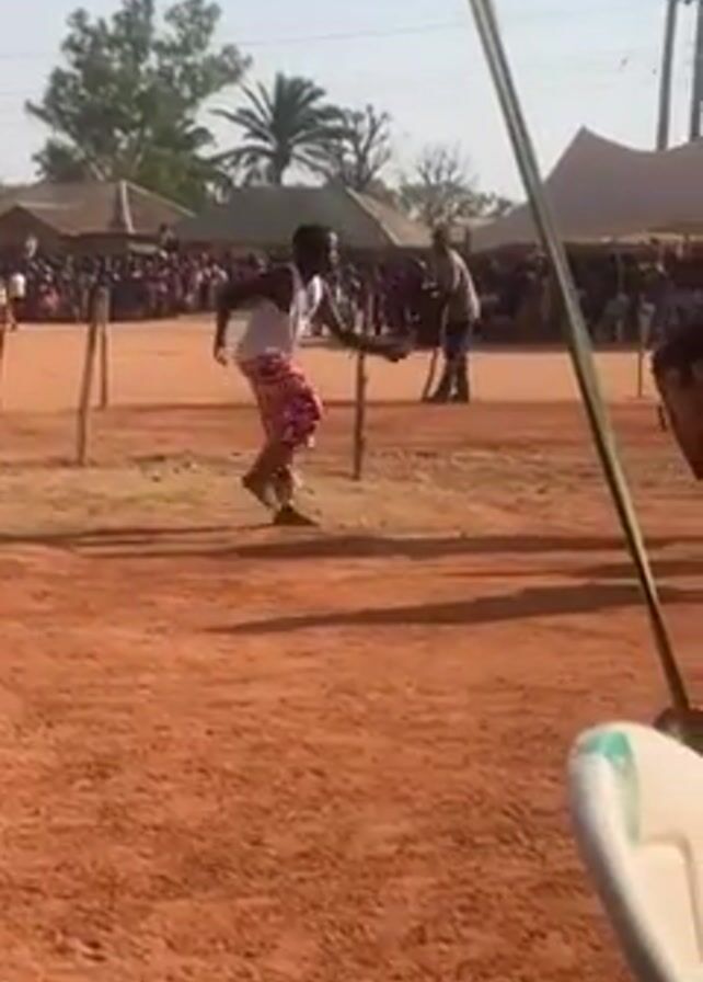 medium shot of a person dancing on a red dirt ground, surrounded by a crowd of people. The dancer is wearing a white tank top and colorful patterned pants. To the right of the dancer, another person is playing a drum. The background includes a line of trees, some buildings, and a flag. The scene appears to be taking place outdoors during the day. There are poles marking off the dancing area. The camera is slightly shaky, and the shot is partially obstructed by a white plastic chair and some tent poles.