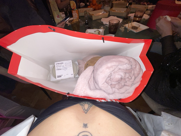 A red and white gift bag overflows with items. Inside, a package labeled "UTBJUDANDE" sits beside a rolled pink blanket. The bag rests against a person wearing a low-cut top, revealing tattoos on their chest and stomach. A table laden with food, drinks, and assorted items is visible in the background, suggesting a gathering or party.