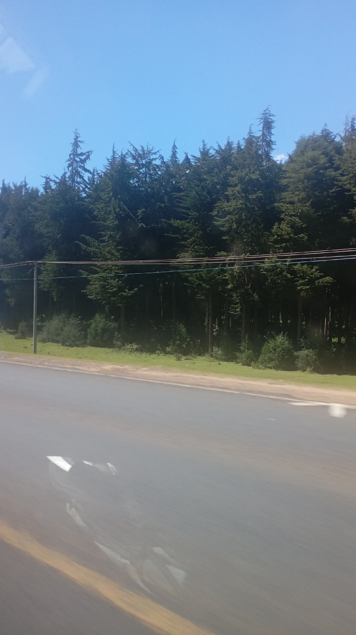 A road stretches into the distance under a clear blue sky. A dense line of evergreen trees borders the roadside. Telephone poles are visible among the trees, with wires strung between them. Short bushes and a grassy area separate the trees from the road. The road's surface is grey and reflects the sunlight. A yellow line marks the edge of the road.