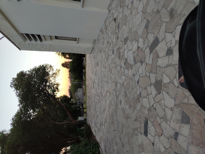 The image depicts an outdoor scene at dusk, situated within the Mate Asher Regional Council, Israel. The foreground is dominated by a paved surface constructed from irregularly shaped, light-colored flagstones. At the bottom center, the bare toes and part of the sole of a human foot are visible above a dark, indeterminate object, suggesting a first-person perspective. To the right, a segment of a light-colored, presumably two-story building with a textured facade is present. This structure features prominent horizontal architectural elements near its upper portion and a dark-framed window on its visible side. To the left, a large, mature tree with dense, dark foliage stands prominently. Beyond this tree, a paved path extends into an open area. In the mid-distance, several dark outdoor benches or seating arrangements are discernible, positioned near a small, light-colored structure, possibly made of concrete or stone. A flagpole with a dark, possibly green, flag or banner is visible to the left of this small structure. The background features a sunset sky displaying a gradient of orange, pink, and yellow hues near the horizon, transitioning to lighter and then darker blues overhead. Silhouetted tree lines are visible against the vibrant sky. No active individuals or specific interactions are depicted, beyond the partial view of the foot.