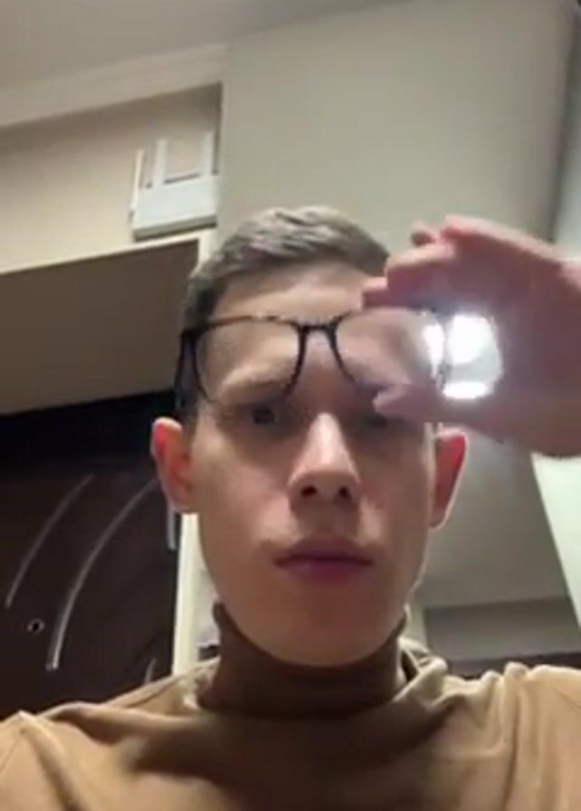 A close-up, low-angle shot shows a young man indoors. He wears black-framed glasses and a tan turtleneck sweater. He removes his glasses with his right hand. The background includes a light-colored wall, a dark-colored door with grooves, and a white object. The lighting is bright and appears to be artificial.