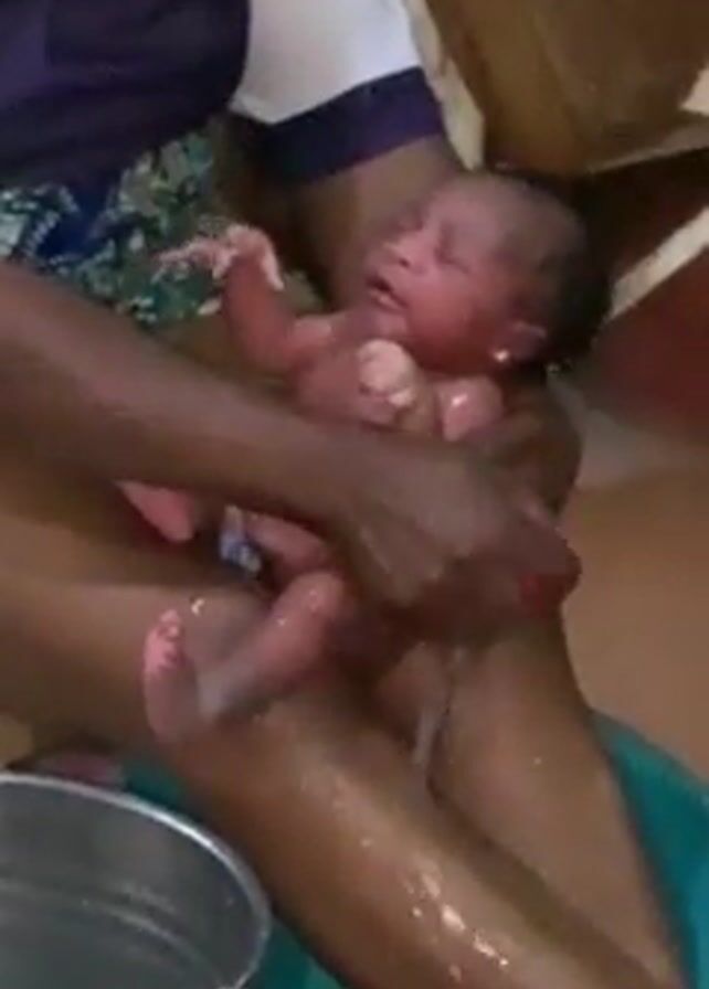 A person is bathing a newborn baby on their lap. The person is wearing a navy blue and white striped shirt and patterned shorts. The baby, who is held in the person's hands, is pinkish and appears distressed. There is a silver bucket to the left of the person's legs, and a teal tub is visible underneath. The background is blurry, but a light brown, textured surface is visible on the upper right.
