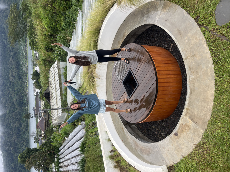 Two young women stand on a wooden platform with a square opening, arms outstretched, amidst greenery and water bodies