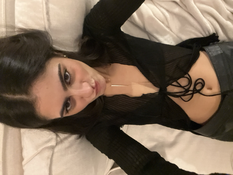 A young woman lies on her back on a white surface, possibly a bed or couch. She is wearing a black, sheer, long-sleeved top tied at the stomach, revealing her midriff. Her dark hair is loose around her head. She is looking directly at the camera with a slightly pursed expression. A gold necklace is visible around her neck. The photo appears to be taken from an overhead perspective, with the woman slightly angled towards the viewer.