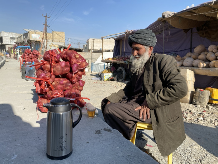 An outdoor market scene in Gundigan Village, Afghanistan, is depicted under clear daylight. An elderly man with a long white beard and a dark turban sits on a yellow plastic stool in the right foreground, wearing a dark brown jacket and trousers. He looks to his left, appearing to rest. To the immediate left of his stool, a small glass cup containing a light-brown liquid is on the ground. In the central foreground, a silver thermal carafe with a black lid and handle, featuring a floral etching, rests on the concrete surface. Dominating the left and center-left of the image are substantial piles of red onions, individually packed in red mesh bags with red ties. These bags are stacked high, suggesting they are on a vehicle or cart partially visible behind them. In the midground, behind the seated man, is a makeshift market stall with a beige tarp roof supported by poles. Underneath this tarp, numerous large, light-colored gourds or squashes are arranged on a wooden platform. Further left, additional produce is visible in another stall. The ground transitions from concrete in the foreground to packed dirt and gravel in the midground and background. In the background, low-rise, light-colored buildings with flat roofs are visible, along with wooden utility poles and overhead power lines. The sky is bright blue and clear, and strong sunlight casts distinct shadows.