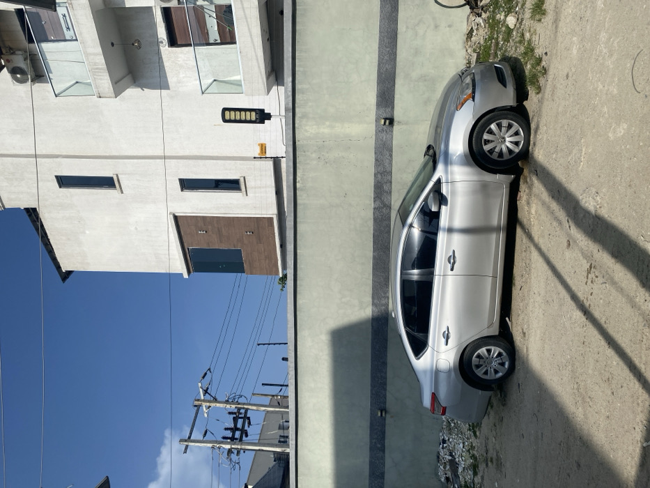 This image depicts an exterior scene in Alaguntan, Nigeria, under direct sunlight with a clear blue sky. A silver four-door Nissan Sentra sedan is parked on a compacted dirt and gravel surface in the foreground, oriented towards the right. It is positioned adjacent to a light grey concrete wall, which features a darker grey horizontal stripe in its lower section. Behind this wall stands a multi-story building with a light-colored stucco facade. The building incorporates tall, narrow vertical windows, a section with brown wood paneling and a large dark-tinted window on its left, and balconies with clear glass railings on its right. An external air conditioning unit is mounted on the upper right side of the building, and a pendant light fixture hangs from a balcony soffit. A black, rectangular solar-powered street light is affixed to a pole positioned behind the concrete wall. In the upper left background, two wooden utility poles with electrical transformers and numerous overhead power lines are visible. Scattered small debris and sparse dry vegetation are present on the ground near the vehicle and the wall. No individuals are visible, and no active events are occurring. Shadows on the ground and wall indicate a high sun angle.