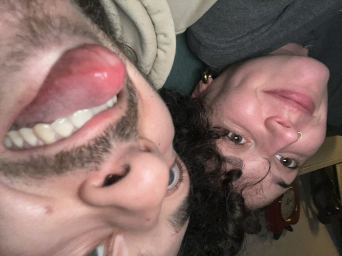 The image portrays two individuals positioned in close proximity, indoors, in Carnin, France. On the left, a female subject with fair skin, dark curly hair, and brown eyes smiles with closed lips, facing the camera. She exhibits a gold nose ring in her right nostril and a gold hoop earring in her left ear, wearing a dark grey top. To the right, a male subject's right facial profile dominates the frame, appearing closer to the camera. He possesses light skin, a brown stubble beard, and a mustache. His right eye is partially visible, and his mouth is open, revealing teeth with his tongue extended forward. He is clad in a light-colored hooded garment. The background behind the female is dark, with a partially visible red, apple-shaped object on a surface. The scene is illuminated by ambient lighting.