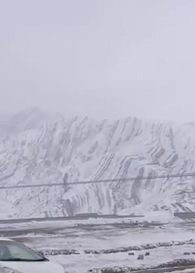 snow-covered mountain range on a cloudy day. The mountains have a striated appearance due to the layers of rock and snow. A two-lane road runs in front of the mountains, and a white car drives by on the road. The foreground is also covered in snow. There are some power lines visible running alongside the road. The sky is overcast, making for a very bright and diffused light.