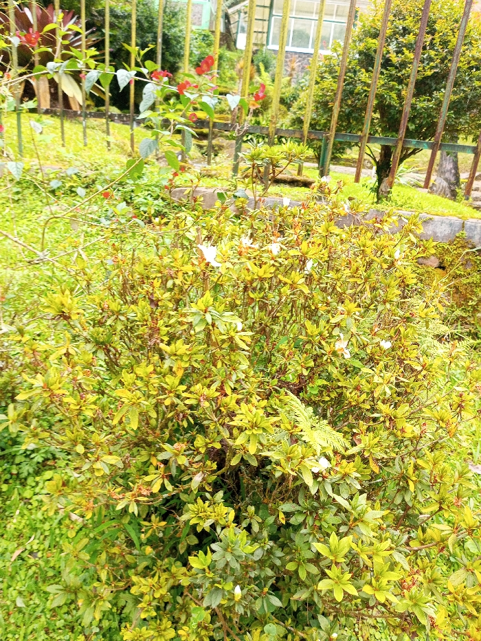 A lush garden scene showcases a variety of plants. A central bush with dense, yellow-green foliage and scattered white flowers dominates the foreground. Red-flowered vines climb a green metal fence in the background, partially obscuring a building with glass windows. Various low-lying plants cover the ground, adding to the vibrant, naturalistic composition. Stone elements are present, suggesting landscaping or bordering features within the garden.