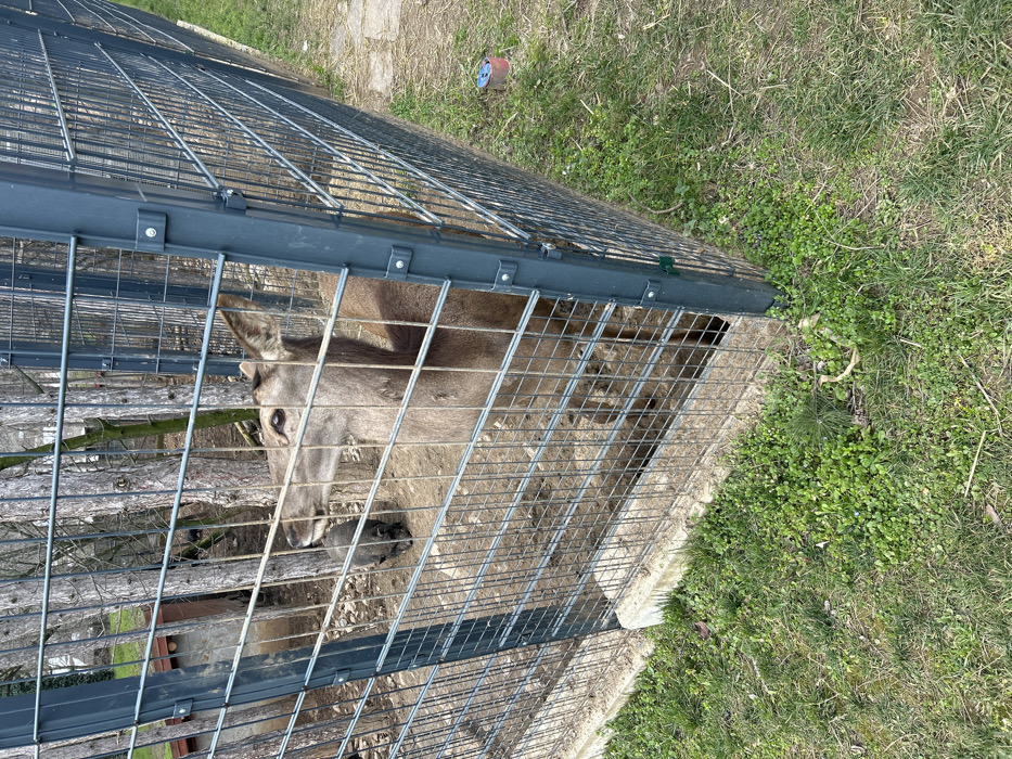 The scene is an outdoor animal enclosure located in Stara Zagora, Bulgaria. A large, light-brown deer, possibly a hind, stands inside the enclosure, positioned behind a grey metal mesh fence. The deer is facing left with its head slightly raised and turned, its right eye visible. Its body is partially visible from the mid-section downwards, obscured by the fence's vertical bars. In the background within the enclosure, a smaller, dark-colored animal, resembling a piglet or juvenile wild boar, is partially visible to the left of the deer, appearing to face downwards. The enclosure is constructed with grey metal fence panels featuring a grid pattern, supported by vertical posts secured with visible bolts. A concrete or stone base underlies the fence panels. The ground within the enclosure consists of disturbed earth and sparse vegetation. Several bare deciduous tree trunks are visible in the background, and a rudimentary wooden structure or shelter is partially visible on the far left. Outside the enclosure, the foreground and right side of the image display green grass with scattered weeds. A small, cylindrical object, primarily red and blue, is present on the grass to the right of the fence.