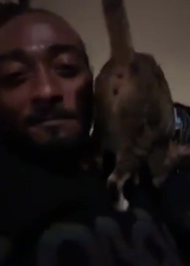 A man with dark skin and a beard is facing the camera. He's wearing a black shirt. A tabby cat is standing on his shoulder with its tail in the air. The environment appears to be indoors.