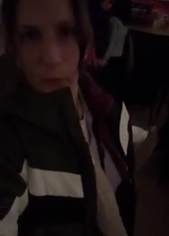 A woman with brown hair and a light complexion looks at the camera in a selfie video. She is wearing a grey jacket with a white stripe and a maroon collar. The background appears to be a dimly lit indoor space with people sitting and moving around, and some red accents in the lighting or decor. There seems to be loud music or a gathering occurring. The woman smiles slightly and seems to be enjoying the atmosphere.