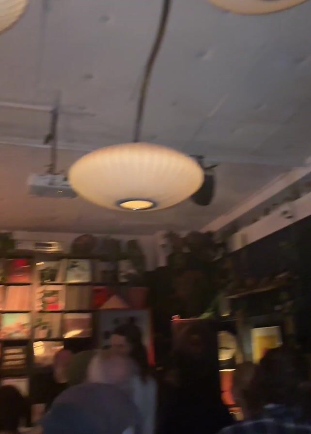 crowded bar or club with people standing, talking, and dancing. The room is dimly lit by several white, circular hanging lamps that dominate the ceiling. There are shelves of vinyl records lining one wall behind the DJ, along with plants and other decorations. A projector and speaker system are hanging from the ceiling. There is a fan visible above the crowd. The overall impression is of a lively and somewhat crowded social gathering.