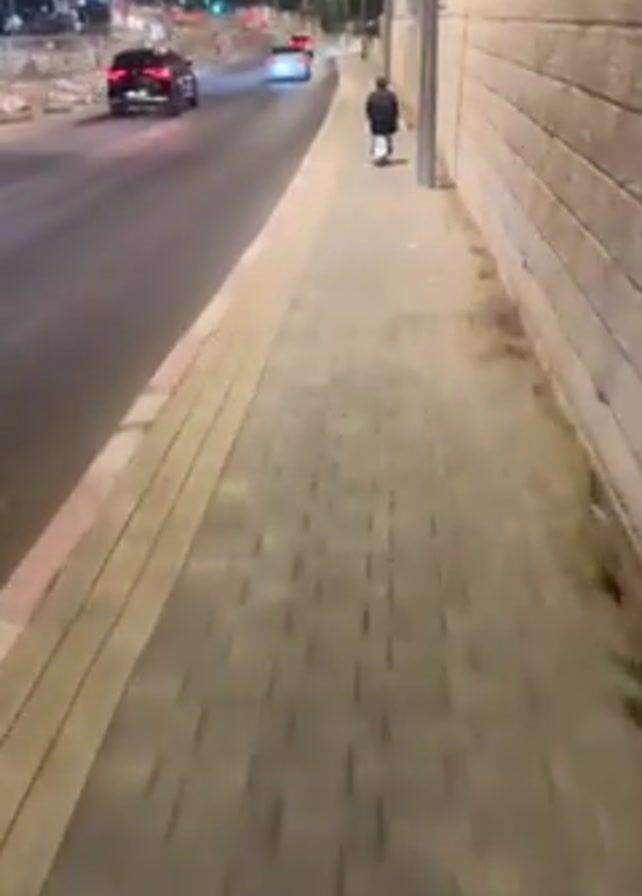 person riding a white one-wheeled electric scooter down a sidewalk at night. The sidewalk is made of gray and beige bricks and is bordered by a low wall made of light-colored stone blocks on one side and a street on the other. Cars and a motorcycle are driving on the street. Streetlights illuminate the scene.