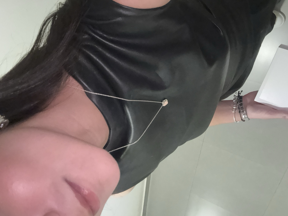 An individual is depicted indoors, angled downwards, with the upper torso and head partially visible from the mid-chest upwards. The person wears a sleeveless, black garment with a high neckline, appearing to be of a sleek, potentially faux leather, material. A thin, silver-colored necklace with a small, light-colored pendant is worn around the neck. A small, intricate earring is visible on the left ear. The individual's left wrist is adorned with multiple bracelets, including a thin silver-colored bangle, a black cord bracelet, and another bracelet featuring dark, square-shaped elements. The person's lower face, including the chin and lower lip, is visible, alongside dark hair on the right side of the frame. A plain white, rectangular box is held in the individual's right hand, positioned in the lower-left portion of the image. The background consists of a light-colored wall and a light-colored floor. The specific location within the city of Santa Catarina, Mexico, cannot be determined from the visual information provided.