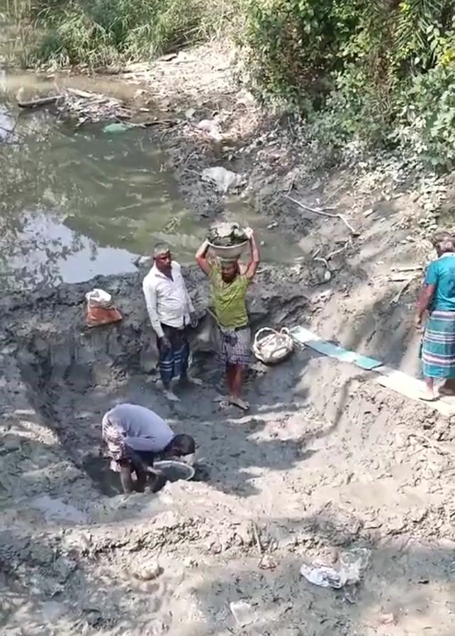 Four men are working in a muddy area beside a body of water. One man is bent over digging in the mud with his hands. Another man is standing beside him with a shovel. A third man is standing and carrying a basket full of dirt on his head. The fourth man is standing and watching the others. The area is surrounded by trees and vegetation. There are also some pieces of plastic and other debris scattered around.