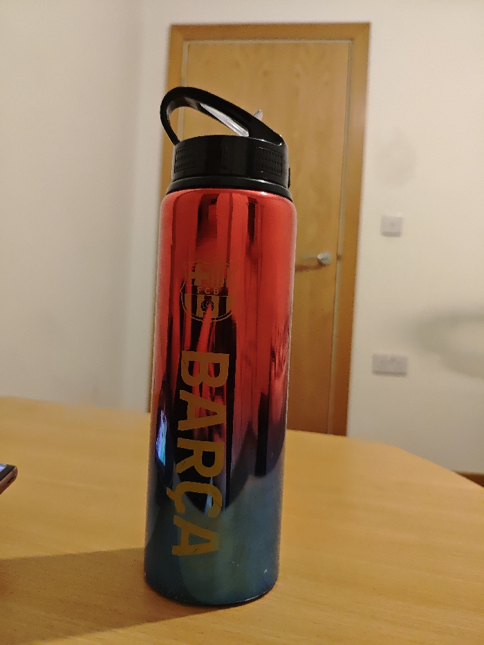 A single cylindrical water bottle stands upright on a light-colored wooden table. The bottle features a metallic red finish at the top, transitioning to a dark, reflective blue or teal towards the bottom, forming a gradient. A gold-colored FC Barcelona crest is visible on the upper portion, with the word "BARÇA" printed vertically in gold below it. The bottle has a black cap with a hinged flip-top lid and an integrated black carry handle. In the background, a plain, off-white wall is visible. A light brown wooden door with a metallic handle is partially visible on the right side of the frame, set back from the table. Two white, rectangular wall-mounted electrical outlets or switches are present on the wall to the right of the door. The lighting is ambient, reflecting off the bottle's surface and indicating an indoor setting. There are no individuals, active movements, or discernible interactions within the frame. The specific location in Swindon, United Kingdom, cannot be determined from the visual information provided.