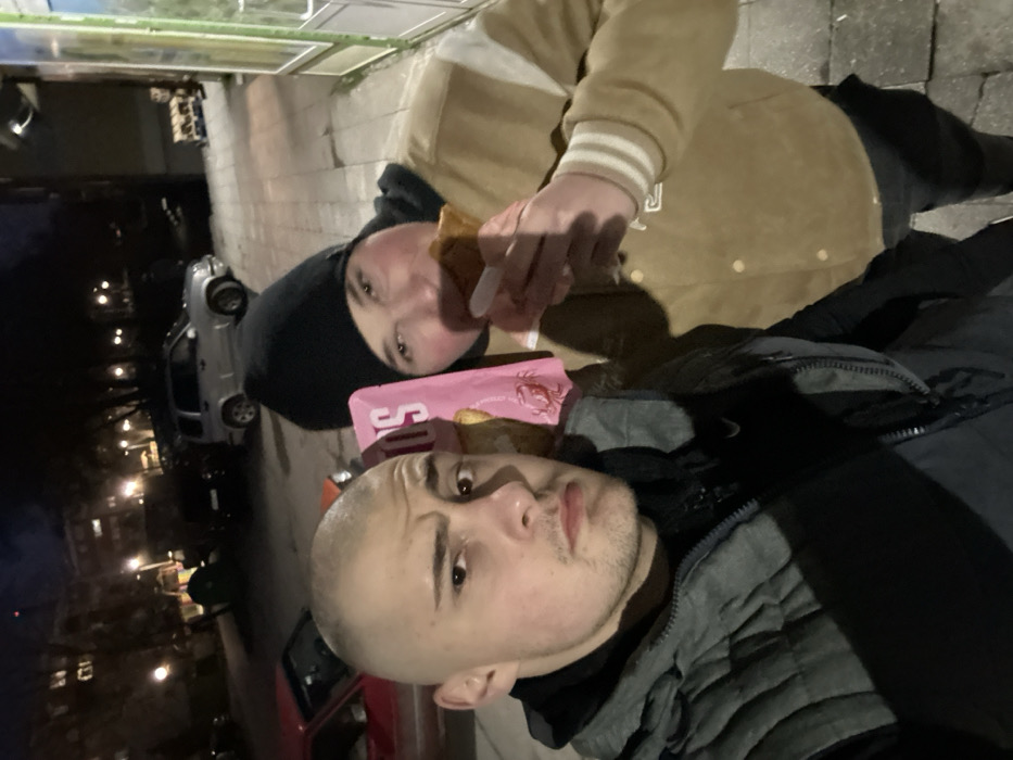 This image depicts two young adult males outdoors at night in Tervel, Bulgaria