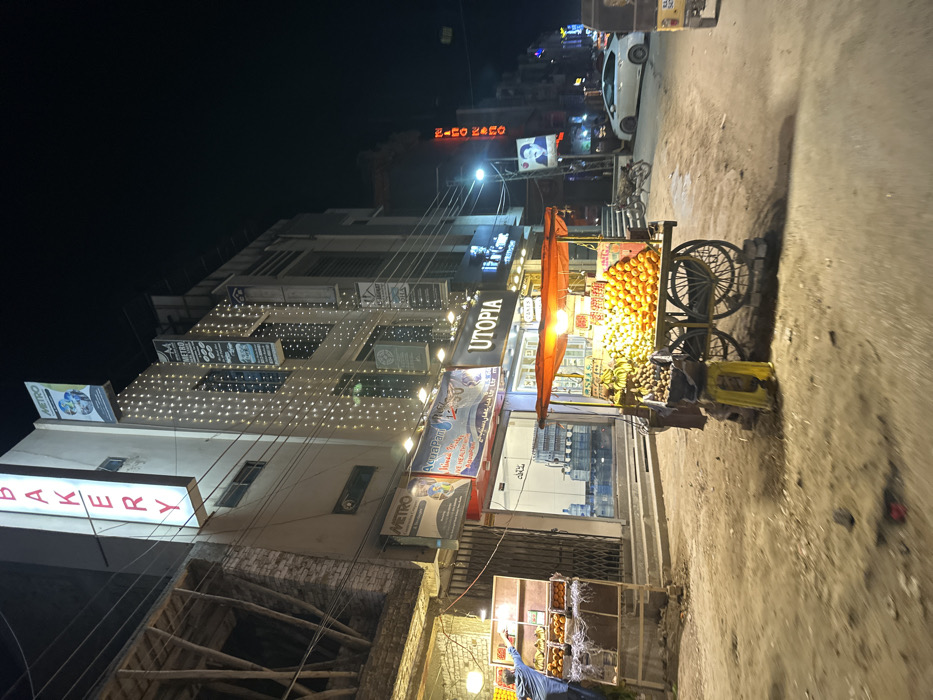 Night scene capturing a street with a vendor cart laden with oranges and bananas under a glowing orange awning