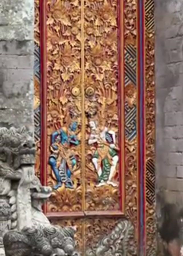 The video displays an ornate double door, intricately carved with floral patterns and two painted figures, set within a stone structure