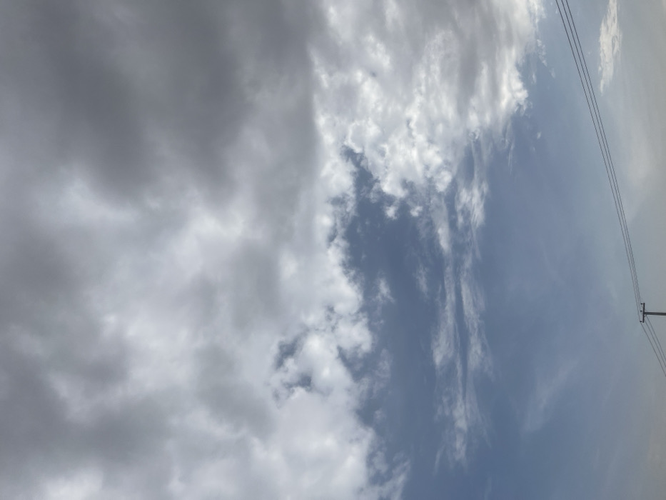 The image depicts a partly cloudy sky. Heavy, gray clouds fill the left portion, contrasting with a lighter, blue sky on the right. Wispy white clouds streak across the blue, creating texture and dimension. A telephone pole with power lines is visible in the upper right corner of the frame.
