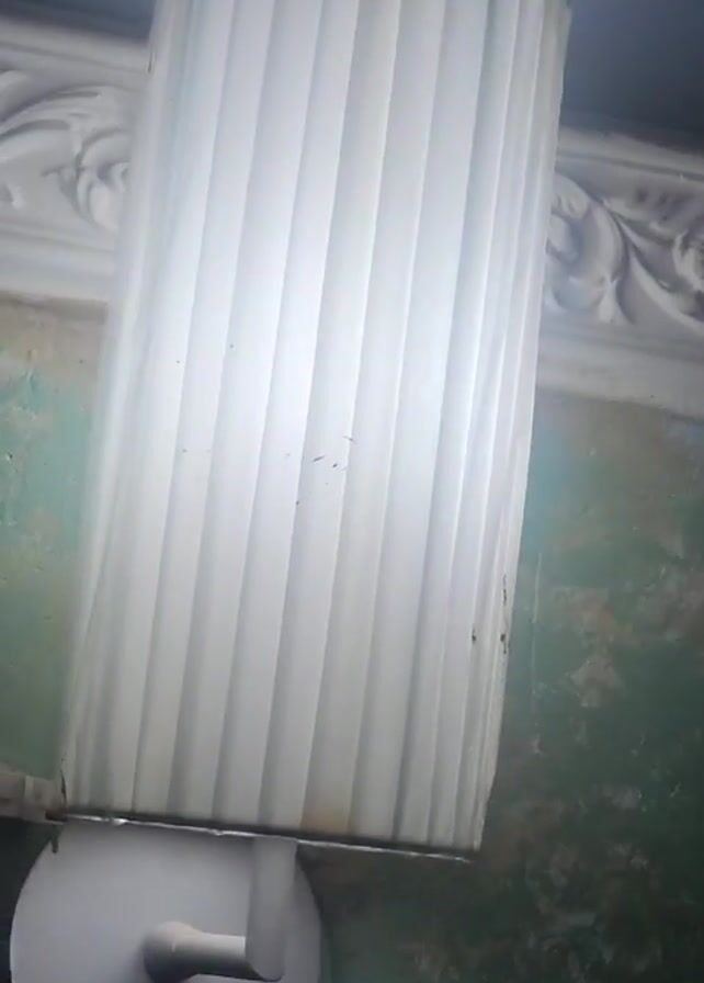 cylindrical wall sconce with vertical ribs. It is white and illuminated from within. The wall behind it has peeling paint and a decorative plaster molding. The ceiling is a light blue.
