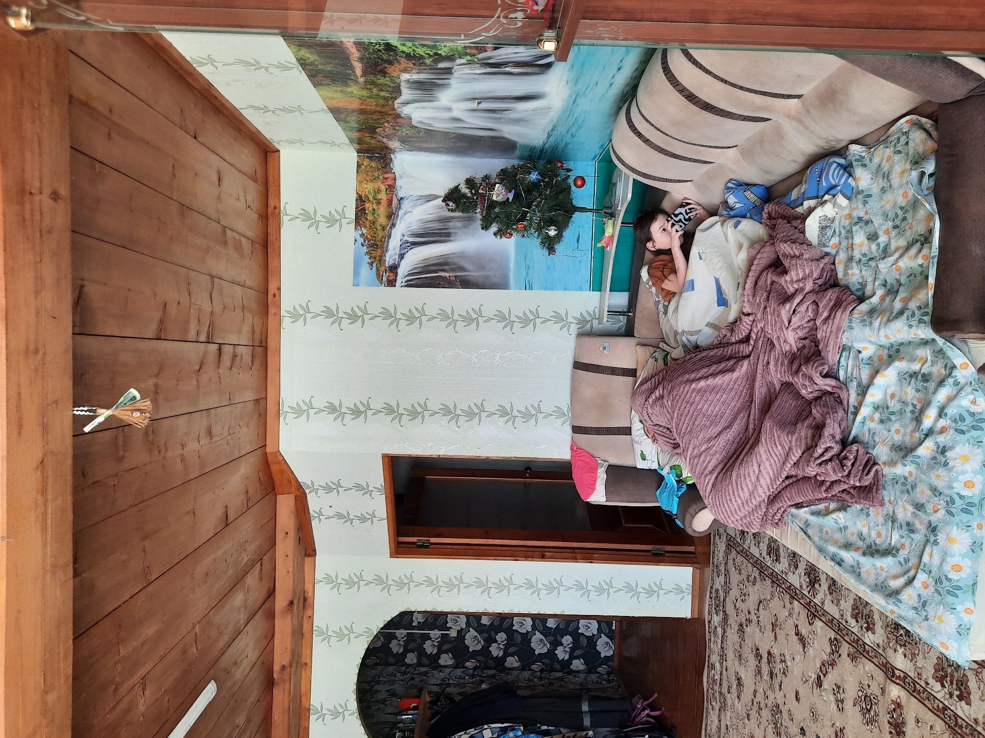 The image displays an indoor domestic scene within a room in Архангельское, Russia. A single individual, appearing to be a child or young person, is lying on a light-colored sectional sofa, covered by a rumpled pile of blankets, including a prominent textured dusty rose-colored blanket and a light blue blanket with a white daisy pattern. The individual, dressed in a brown long-sleeved shirt, is holding and observing a smartphone with a black and white patterned case. The sofa is positioned against two walls covered by a large mural depicting a vibrant waterfall within a natural landscape. In the corner where these mural panels meet, a small, decorated Christmas tree stands on a narrow, light-colored shelf. Adjacent to the mural, another wall features light-colored wallpaper with repetitive vertical patterns of green leaf sprigs. To the left, an arched doorway leads to an adjacent space with dark wallpaper adorned with white floral patterns, revealing clothing on hangers within. Next to the arched doorway, a wooden doorframe with an open, dark wooden door provides a view into another room. The floor in the foreground is covered by a large, ornate beige rug with floral patterns in brown, black, and red. Sections of dark wooden floorboards are visible near the doorways. The ceiling is composed of horizontal wooden planks, from which a white fluorescent light fixture and a small decorative broom-like charm are suspended. A wooden cabinet with glass panels is partially visible on the far right edge of the frame.