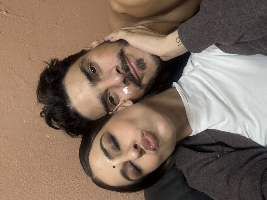 A close-up indoor portrait features two individuals, a female and a male, positioned intimately against a plain terracotta-colored wall